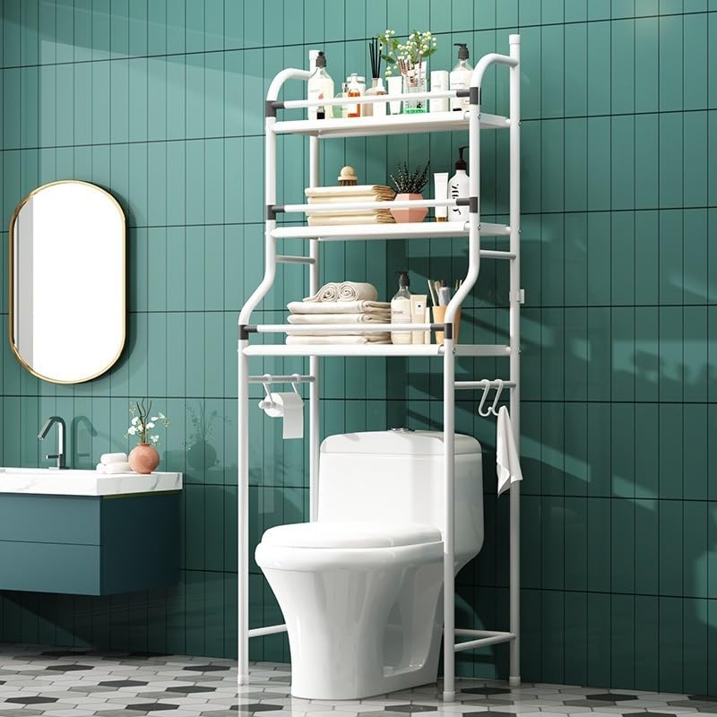Over-the-toilet shelving adds storage without requiring extra square footage. These units typically provide 2-3 shelves in the vertical space above your toilet tank.